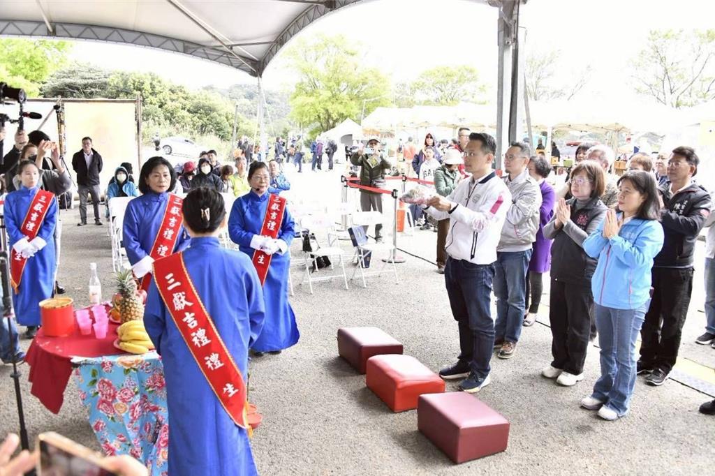 桃園市客家事務局8日首度結合魯冰花季活動,在龍潭區大北坑休閒農業園區舉行「天穿日」祭天儀式,由副市長蘇俊賓擔任主祭,在魯冰花盛開的茶園間重現客家傳統三獻禮,伴隨八音團司樂依循傳統儀程演奏,祈求新的一年