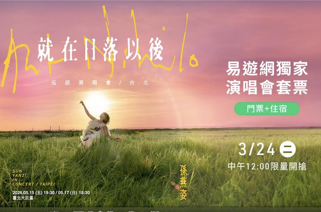 華語樂壇天后孫燕姿即將帶著全新巡演【孫燕姿《就在日落以後》巡迴演唱會-台北】 重返台北舞台,並首登台北大巨蛋開唱,消息一出立刻在歌迷圈掀起高度討論與期待。看準演唱會追星經濟與跨域體驗旅遊趨勢,易遊網以「指定旅遊平台」身份推出獨家演唱會雙人套票,整合門票與飯店住宿打造一站式追星體驗。獨家套票將於24日...