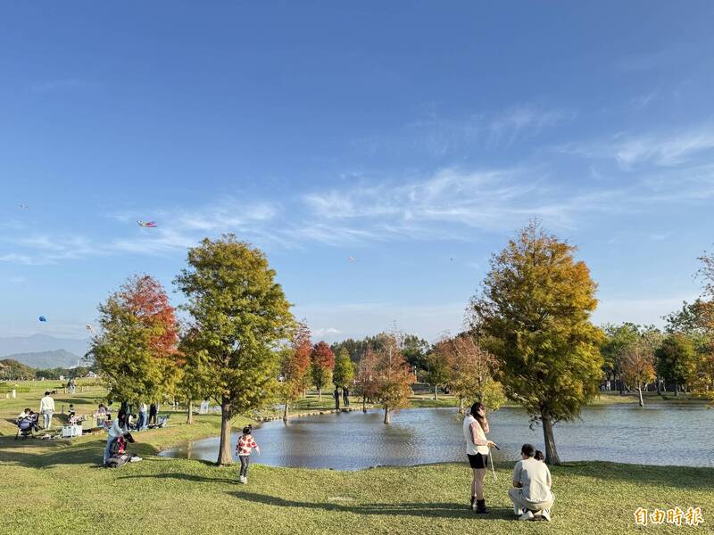 台中市后里環保公園廣達17公頃,人工生態池周邊的落羽松紅了,形成一幅冬日美景,假日吸引許多民眾前往野餐、放風箏、拍照打卡!還有民眾前往休閒運動,十分愜意。后里環保公園原是豐原三鄉市聯合垃圾場,佔地20餘公頃,民國87年封場後,市府在原址進行植栽,其中5公頃規劃做為后里環保苗圃,其餘則以花田拼布概念規劃,民國96年建構完成5座景觀土丘,並劃出2公頃的花海區、3公頃的大草原區、廣達3300平方公尺的人工生態池,還有長約1200公尺的賞花碎石步道等;為強化公園的多元功能,建設局日前投入1584萬元,在公園內打造全新的「孩籽世界遊戲場」。