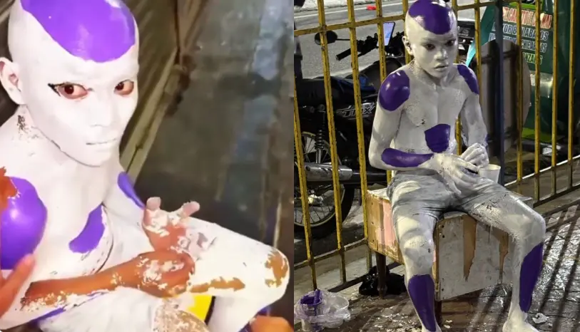 菲律賓一名男童參加角色扮演活動,模仿經典動漫《七龍珠》(Dragon Ball)中的反派角色「弗利沙」(Frieza),家長在男童身上塗上紫色和白色顏料,但顏料其實上是塗刷...