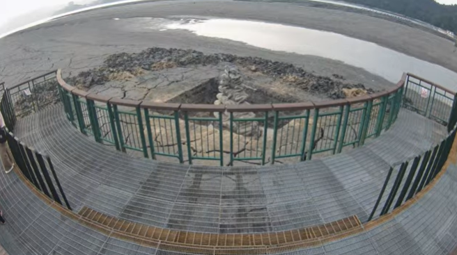 日月潭蓄水率目前約6成、相較滿水位降逾6公尺,位於大竹湖及伊達邵間的水蛙頭步道潭邊露出大面積淤泥,台電公司近日挖除「九蛙疊像」旁乾泥,並為九蛙洗澡,以便遊客欣賞。