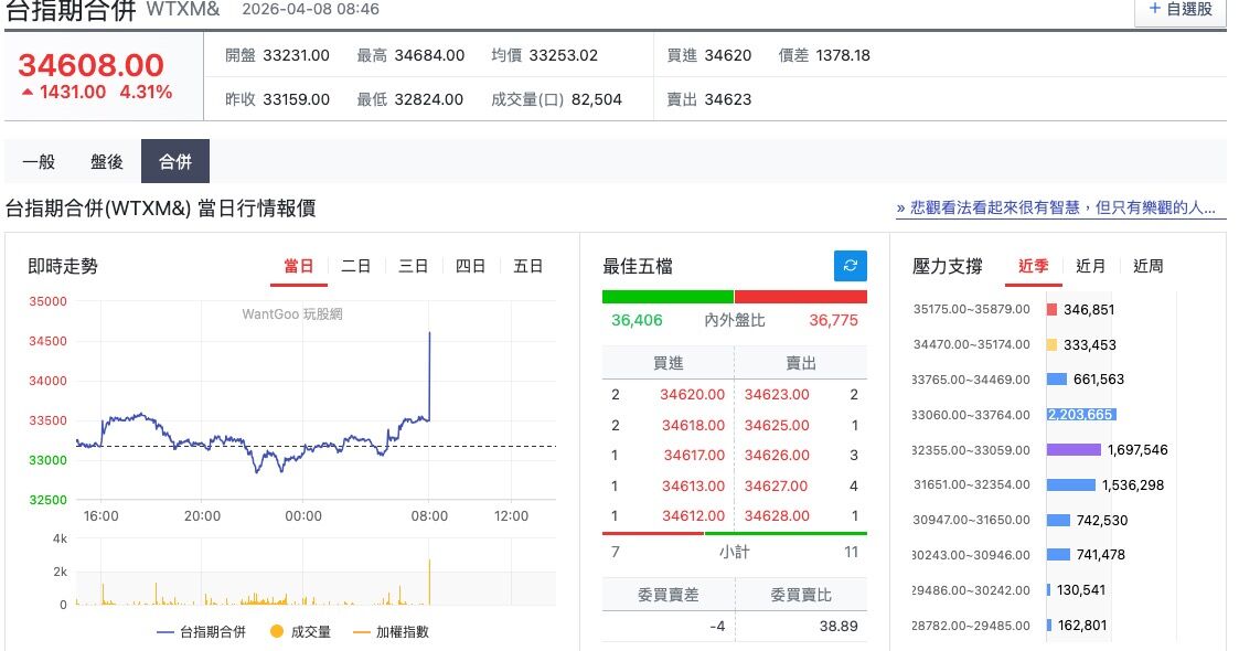 美國與伊朗達成為期兩星期的停火協議,台股8日跳空大漲超過千點,加權指數終場上漲1,531點至34,761點,創史上第二大漲點,台指期更是一度突破35,000點,終場上漲1,819點至34,996點,期現貨轉為正價差234.62點。 統一期貨表示,巴基斯坦居中協調,使伊朗、美國及以色列皆同意為期兩周的...
