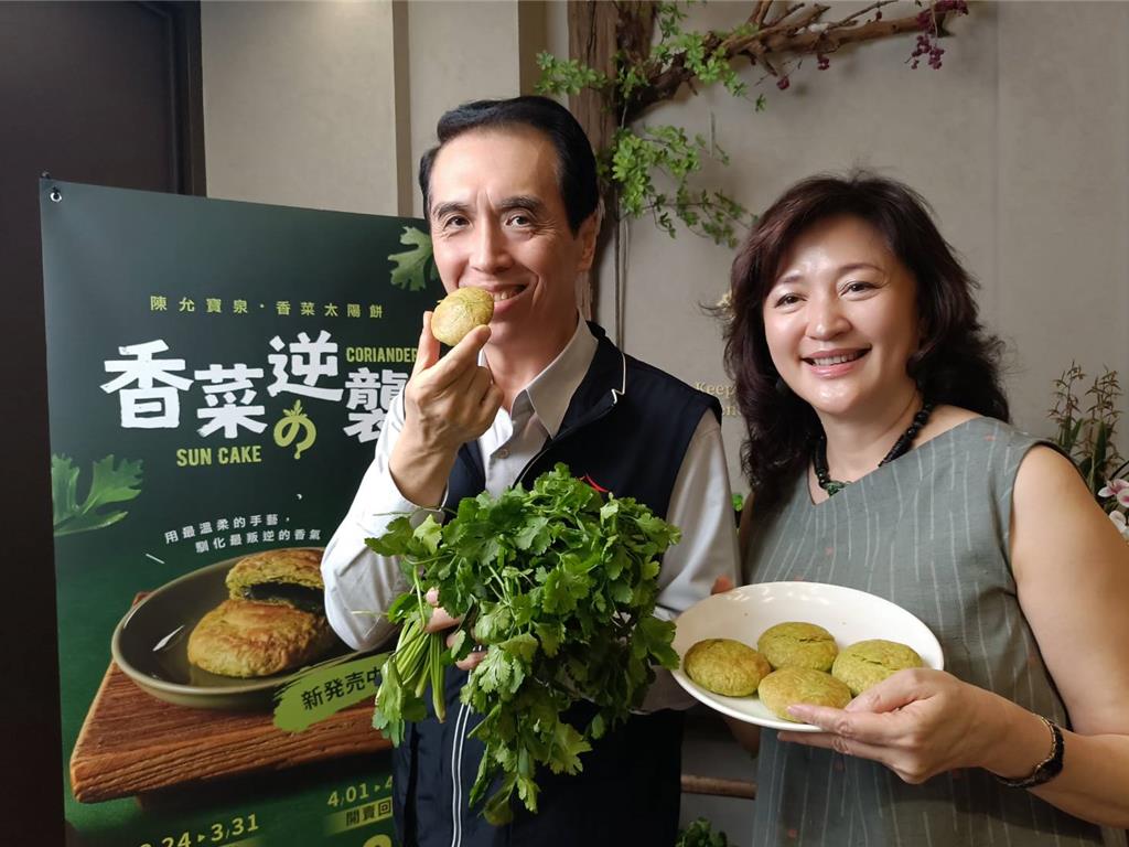 全球掀起一股香菜風,香菜紅透半邊天!2月24日正值「國際討厭香菜日」,但喜愛吃香菜的台中市工策會總幹事陳學聖今天特地走訪自由路百年糕餅店,品嘗獨特的「香菜太陽餅」,他拿起香菜太陽餅開心說,香菜是台灣道地